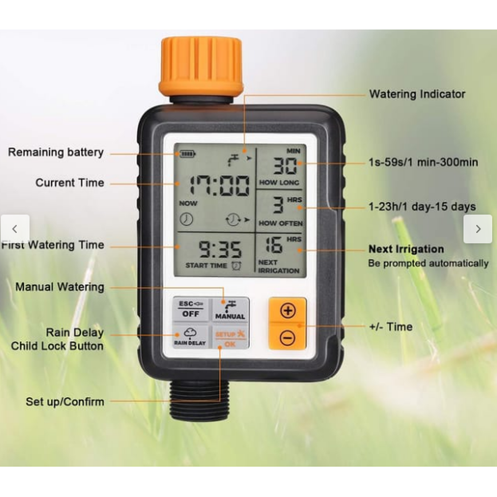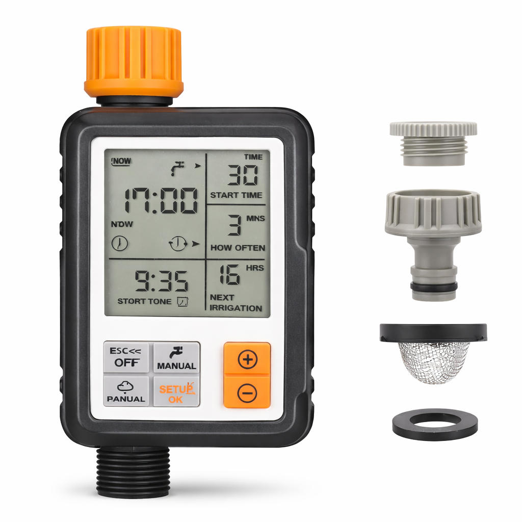 Rega o teu jardim automaticamente mesmo quando não estás em casa. Programável até 7 dias com temporizador integrado. Compatível com qualquer torneira padrão. Inclui 15 metros de mangueira e 30 gotejadores. Ideal para jardins, varandas e hortas.